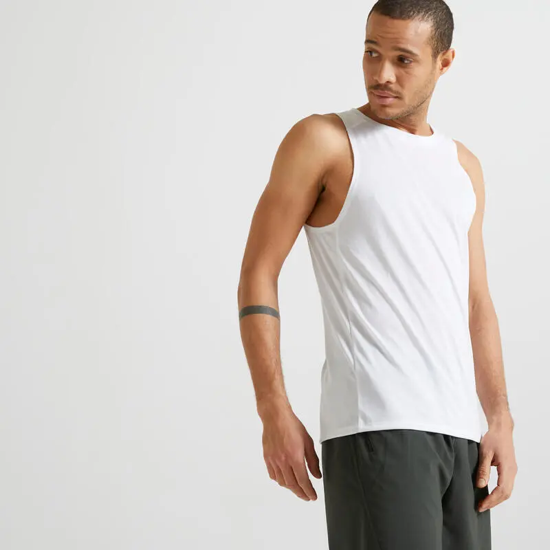 Compra en Decathlon Camiseta fitness sin mangas cardio-training Hombre Domyos 100 ¿Quieres empezar fitness o volverte a poner en forma?Esta camiseta sin mangas será indispensable para todas tus sesiones.Confort garantizado y precio bajo.
