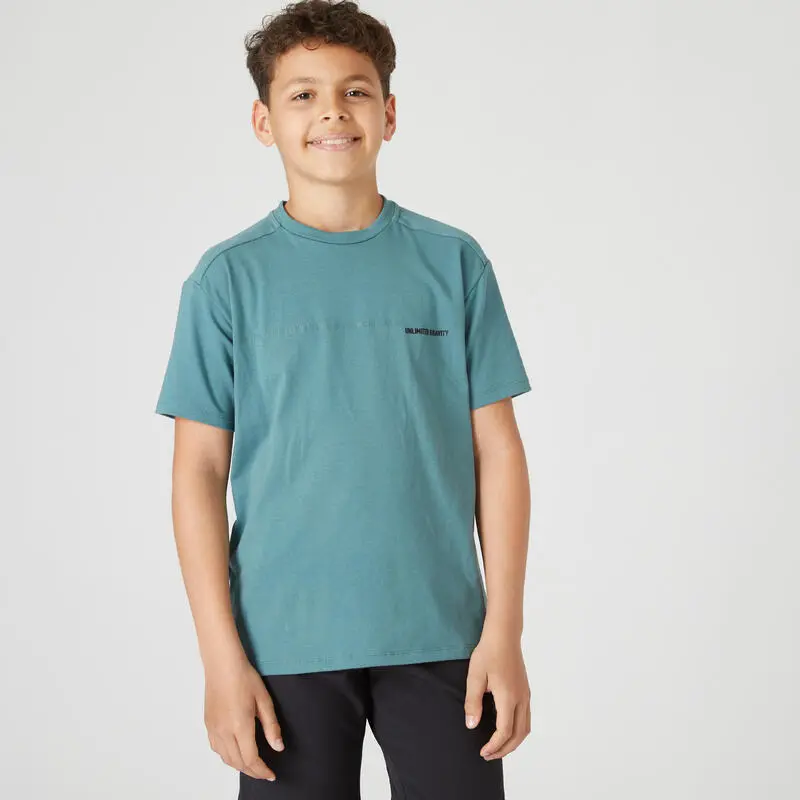 Compra en Decathlon Camiseta gimnasia manga corta algodón transpirable Niños Domyos 500 Una camiseta imprescindible de algodón para acompañar a los niños en sus actividades diarias y en el colegio.