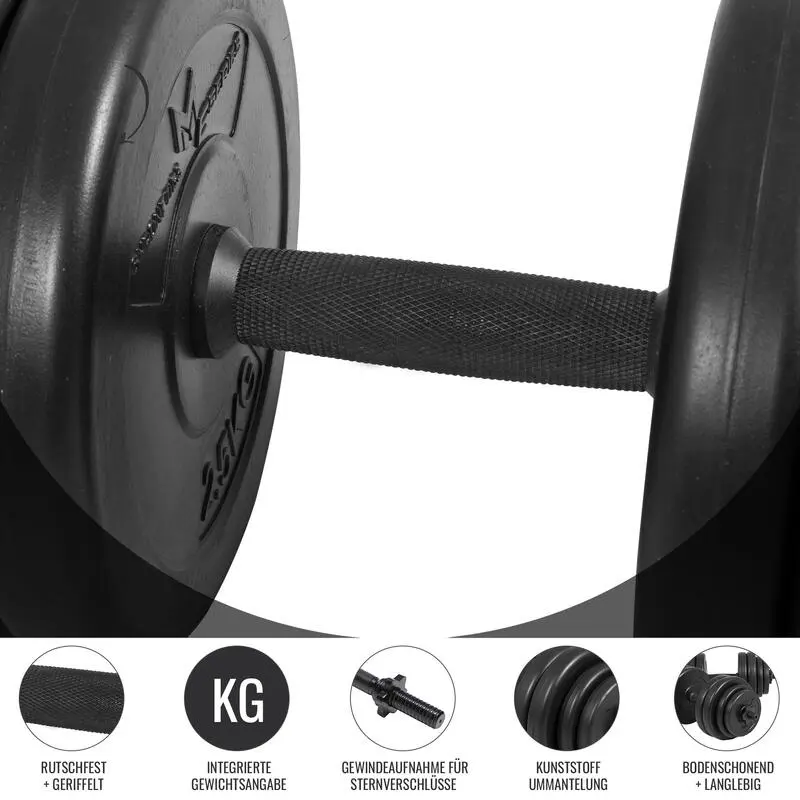 Compra en Decathlon Kit Mancuernas Musculación Gyronetics Negro 30Kg Diámetro 25mm Utilízalo como parte del entrenamiento con mancuernas para aumentar los músculos del pecho, los brazos y los hombros. 2 barras de 45cm.Discos:8 x2,5Kg, 4×1,25kg, 4×0,75Kg